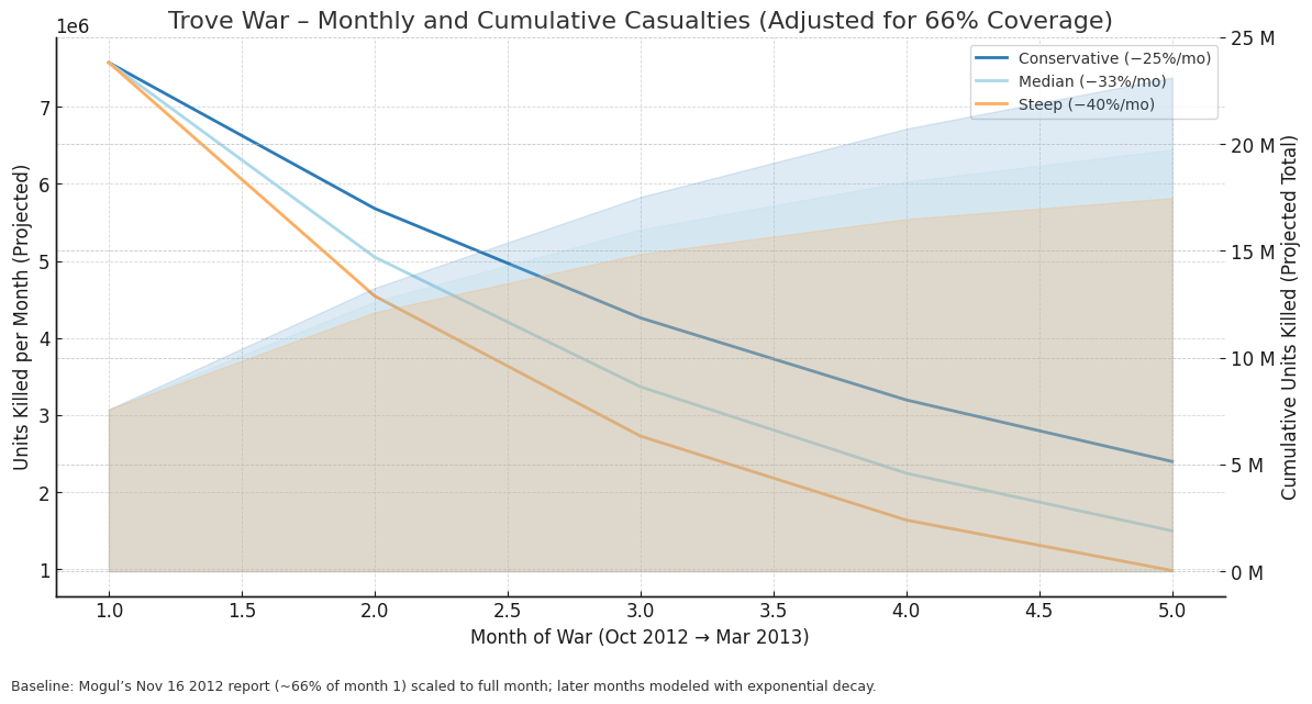 That means his snapshot is incomplete and the true first-month casualties were probably higher.Working from Mogul’s “66%” note, we first scale his month-1 snapshot up to 100% (i.e. multiply by ≈1.5) to represent a full month of fighting, and then apply the same casualty-decay curves we described earlier. This keeps the method the same, but acknowledges that Mogul did not capture every battle in his tally.